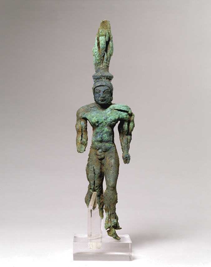 Condition: the volumes save for the head, back, right shoulder and upper arm, buttocks and left leg deformed by radical changes in the original bronze due to bloating and splitting with deep fissures and some of the surface shaly on account of virulent chemical and physiological change induced by water and electro-chemical elements in its burial context - the whole presently stabilized.