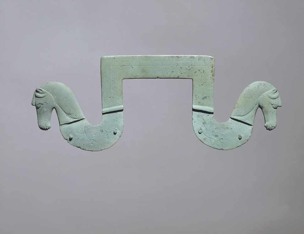 This handle with two horse protomes was one of a pair. Originally, the fairly flat dish of hammered bronze sheet would have measured roughly 57 cm in diameter.