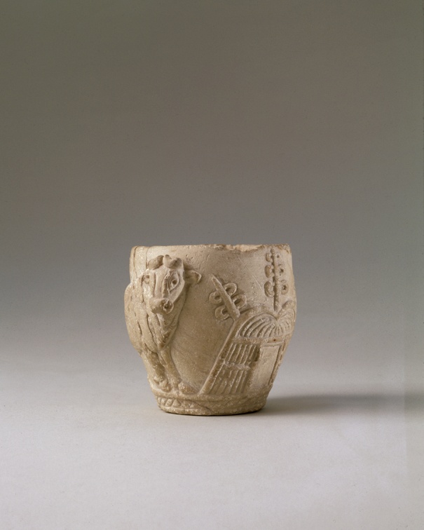 A vessel decorated with a standing bull in low relief, his turned head in high relief; also in low relief a reclining young heifer and a sacred stable surmounted by emblematic poles [1]. The stable built of reeds with reinforced tubular uprights and horizontals. An Early Sumerian bowl in stone from Khafaje has a similar type of representation [2].
