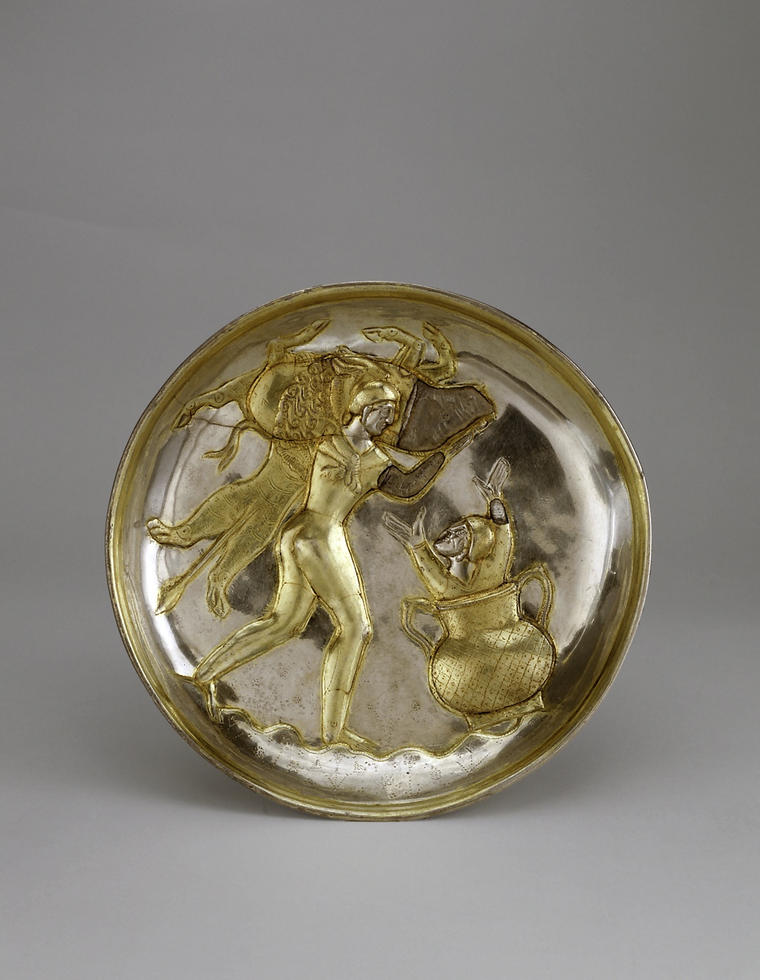 Condition: the gilding worn in places. On the underside two long cracks, parts of which appear on the inside; also smaller cracks on the underside, one of which comes through on the feline's upper hind paw. Missing are the inlays of the boar's head, of most of Herakles' left arm and of a section of Eurystheus' left forearm. The plate slightly warped.